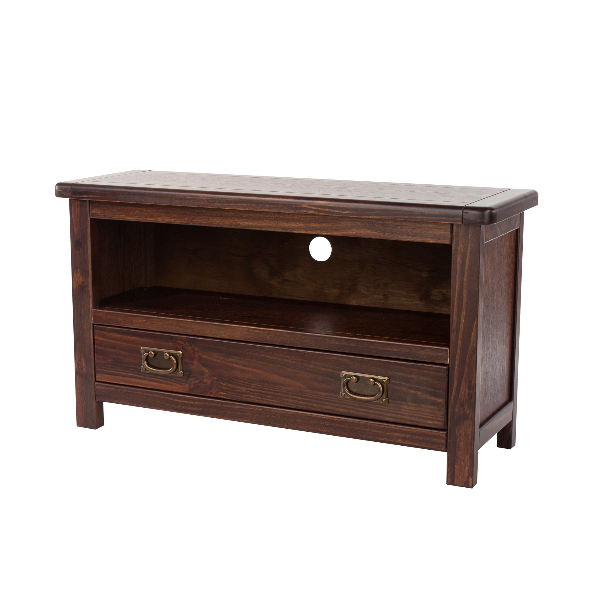 Our compact TV unit provides plenty of suface area for your TV whilst underneath is a handy shelf for storing players and entertainment systems, there is a useful drawer for storage too. The piece combines different woods with a rich dark lacquer finish and real metal handles.