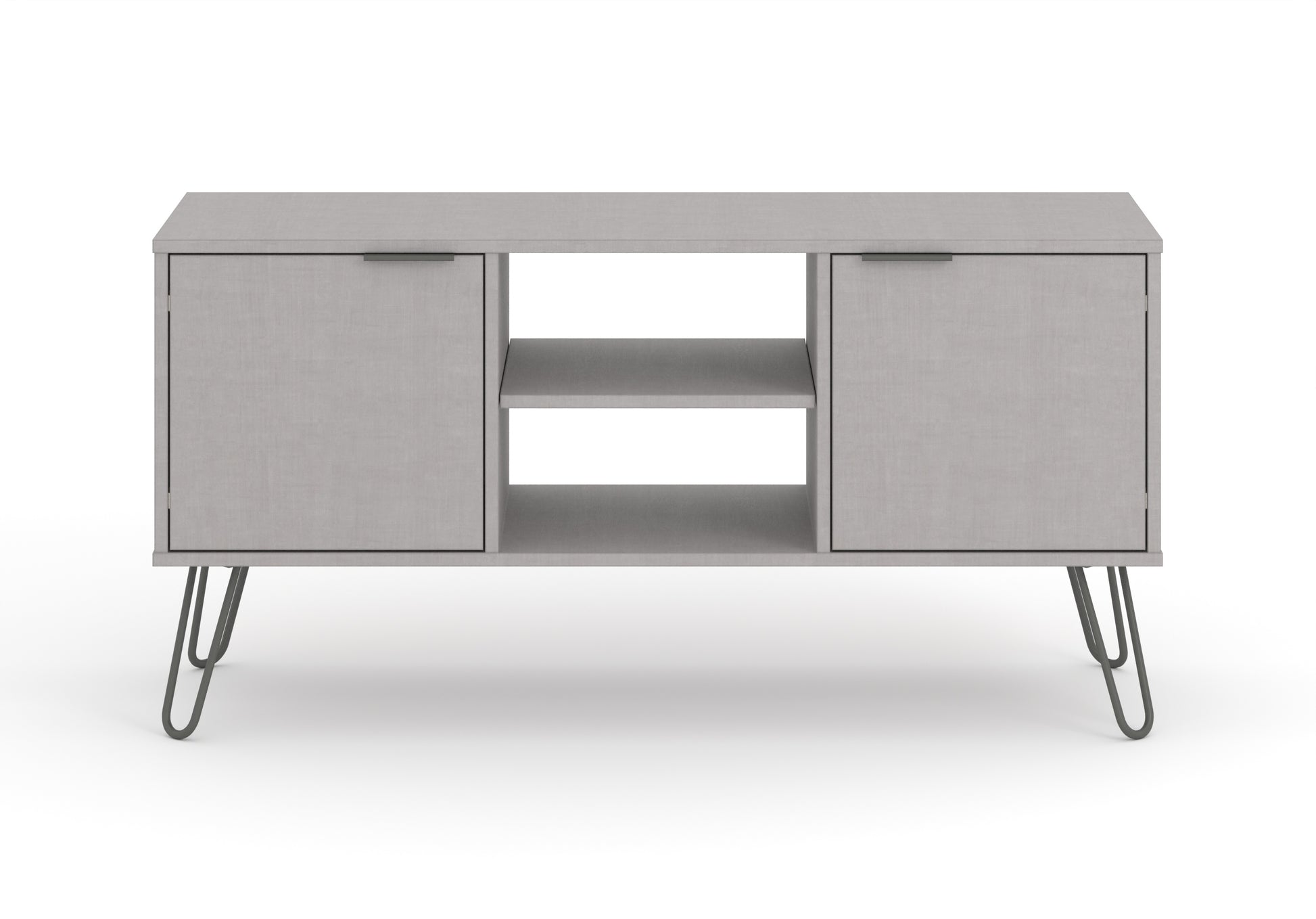 Industial styling and functional, this TV unit features plenty of storage in an easy to clean grey textured melamine finish with real metal handles and feet.