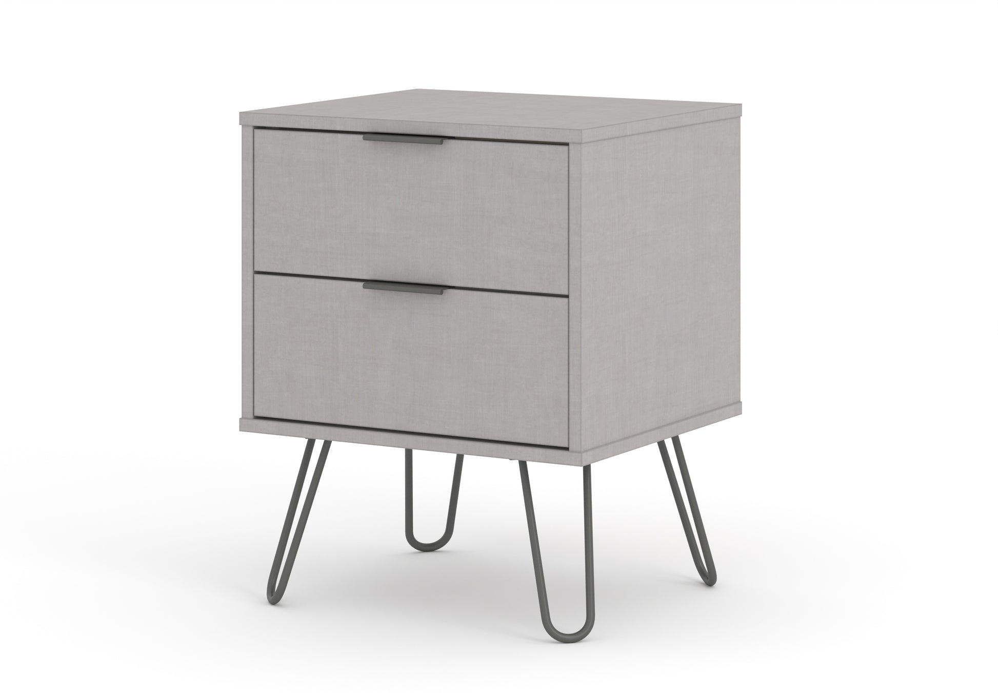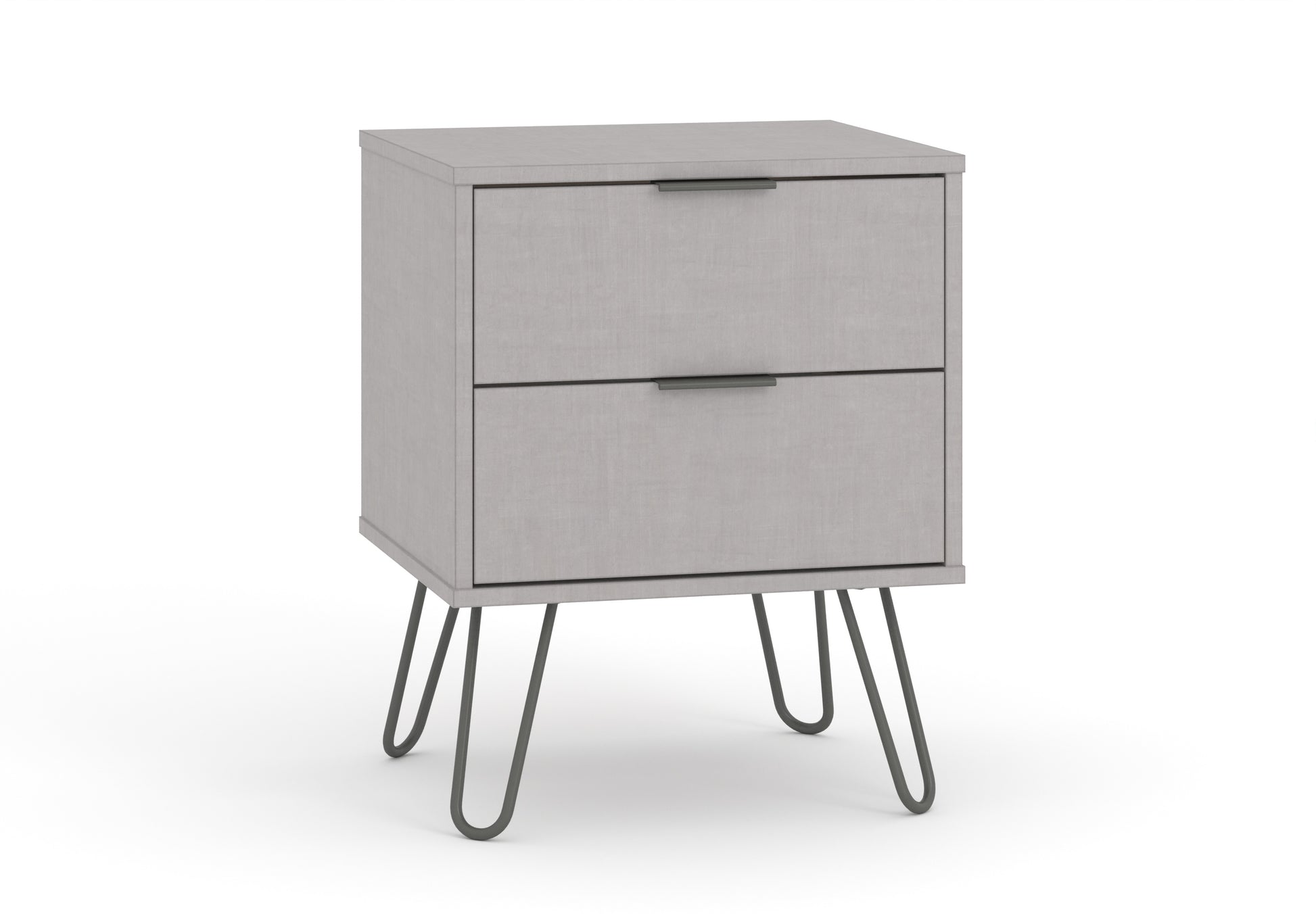 Our industrial look bedside cabinet combines an hardwearing, easy to clean, grey textured melamine finish with plastic pull handles and metal feet.