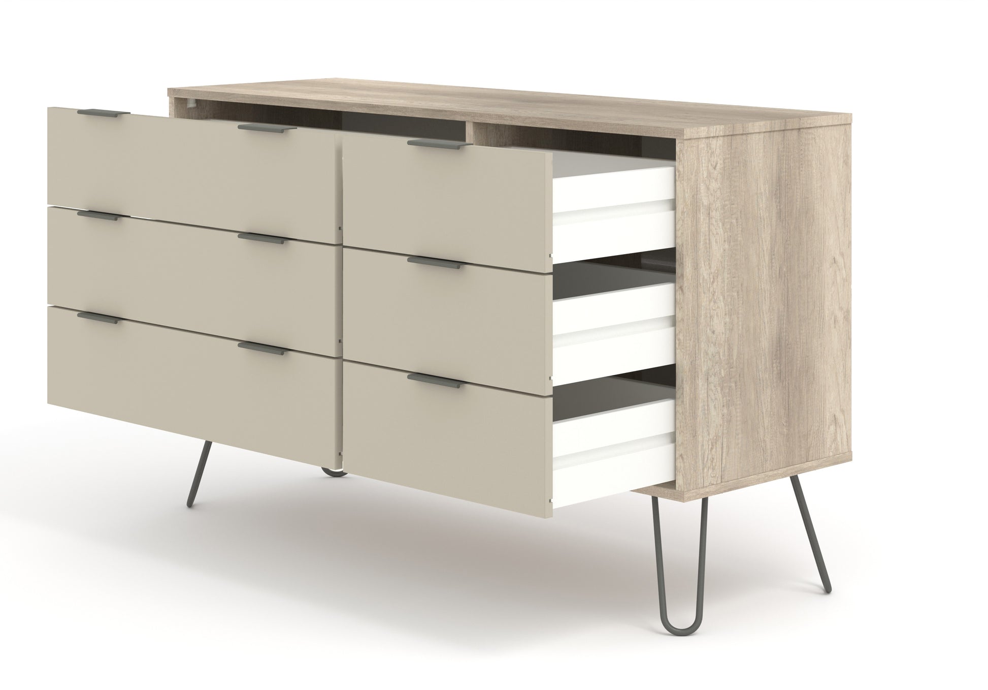 Our wide industrial look chest offers 3 wide and 3 narrow drawers in a stunning combination of driftwood and calico effect finishes in easy to clean melamine with plastic pull handles and metal feet.