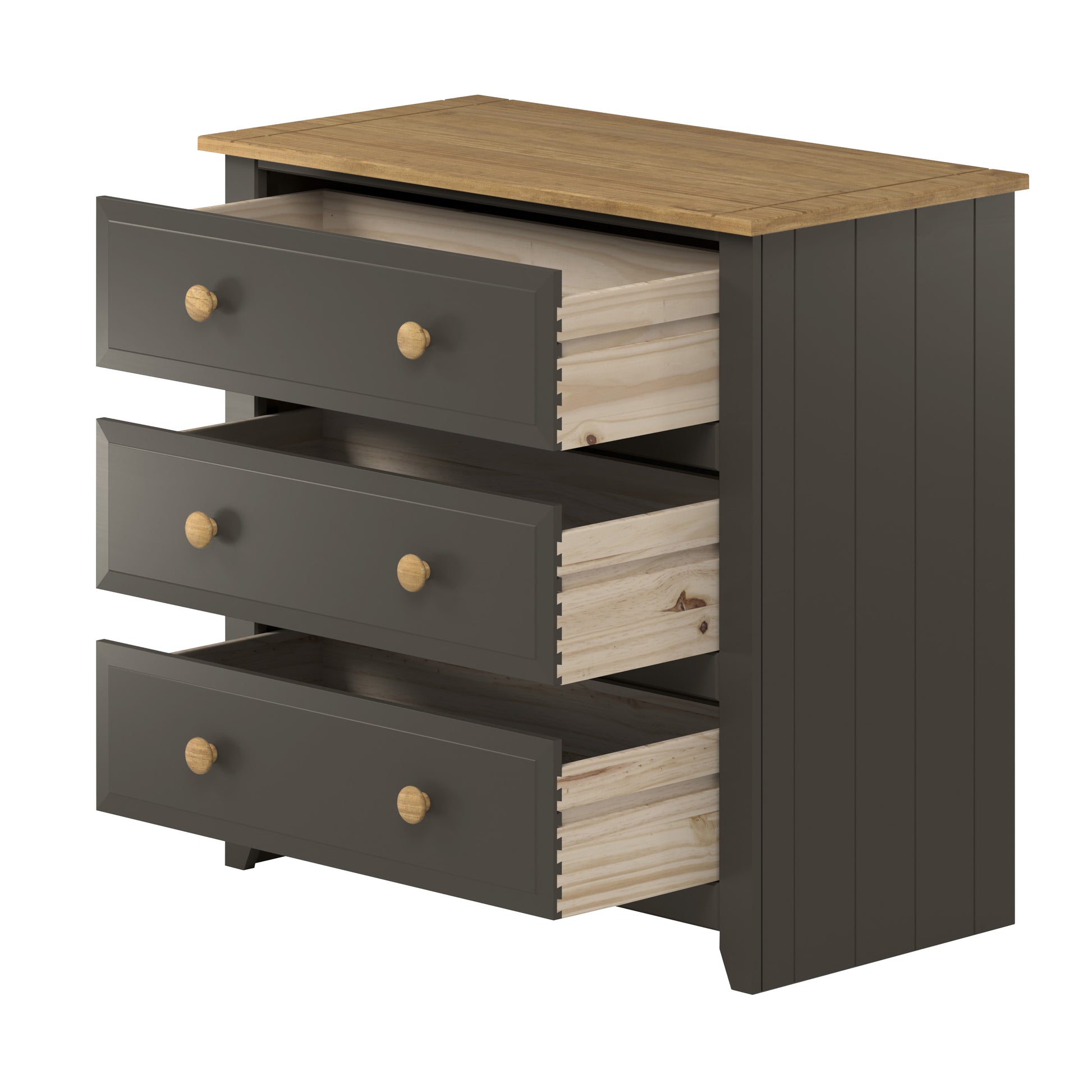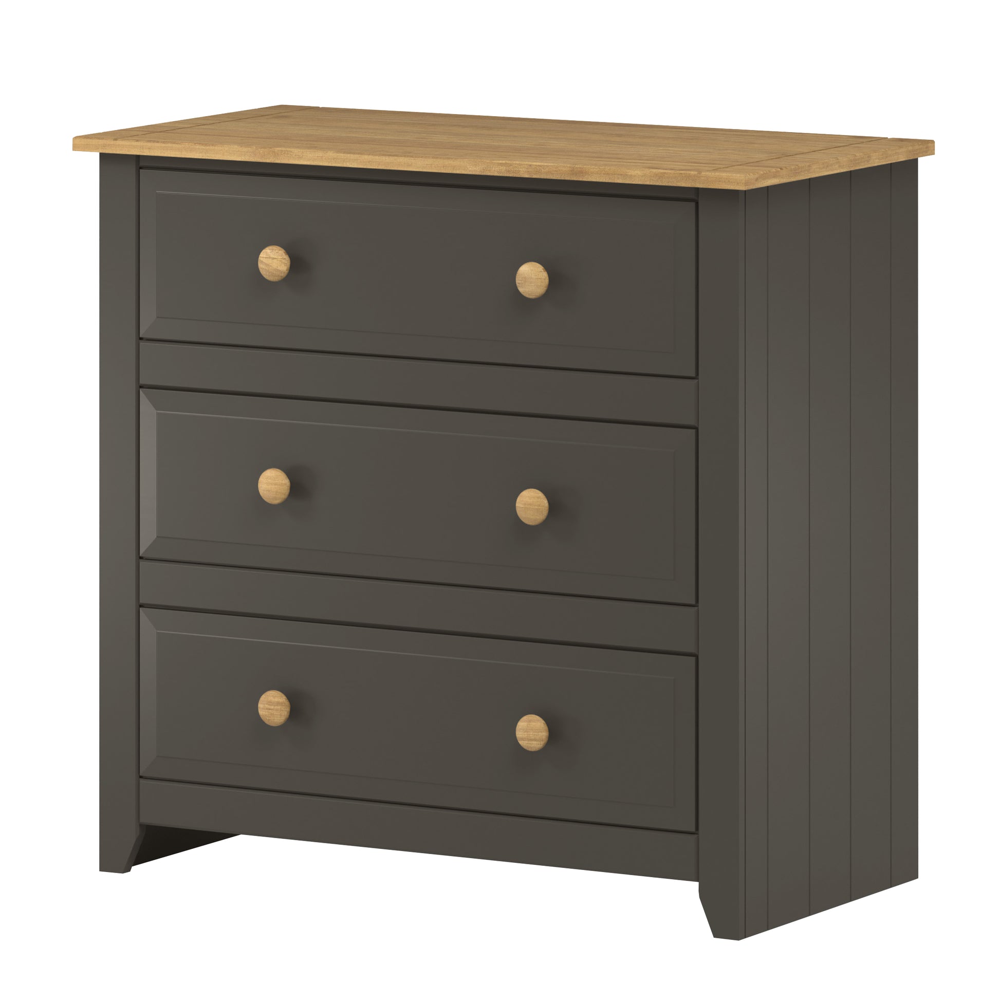 Ideal where space is a premium, our 3 drawer chest is finished in a luxurious carbon colour paint and antique waxed pine top and matching handles.
