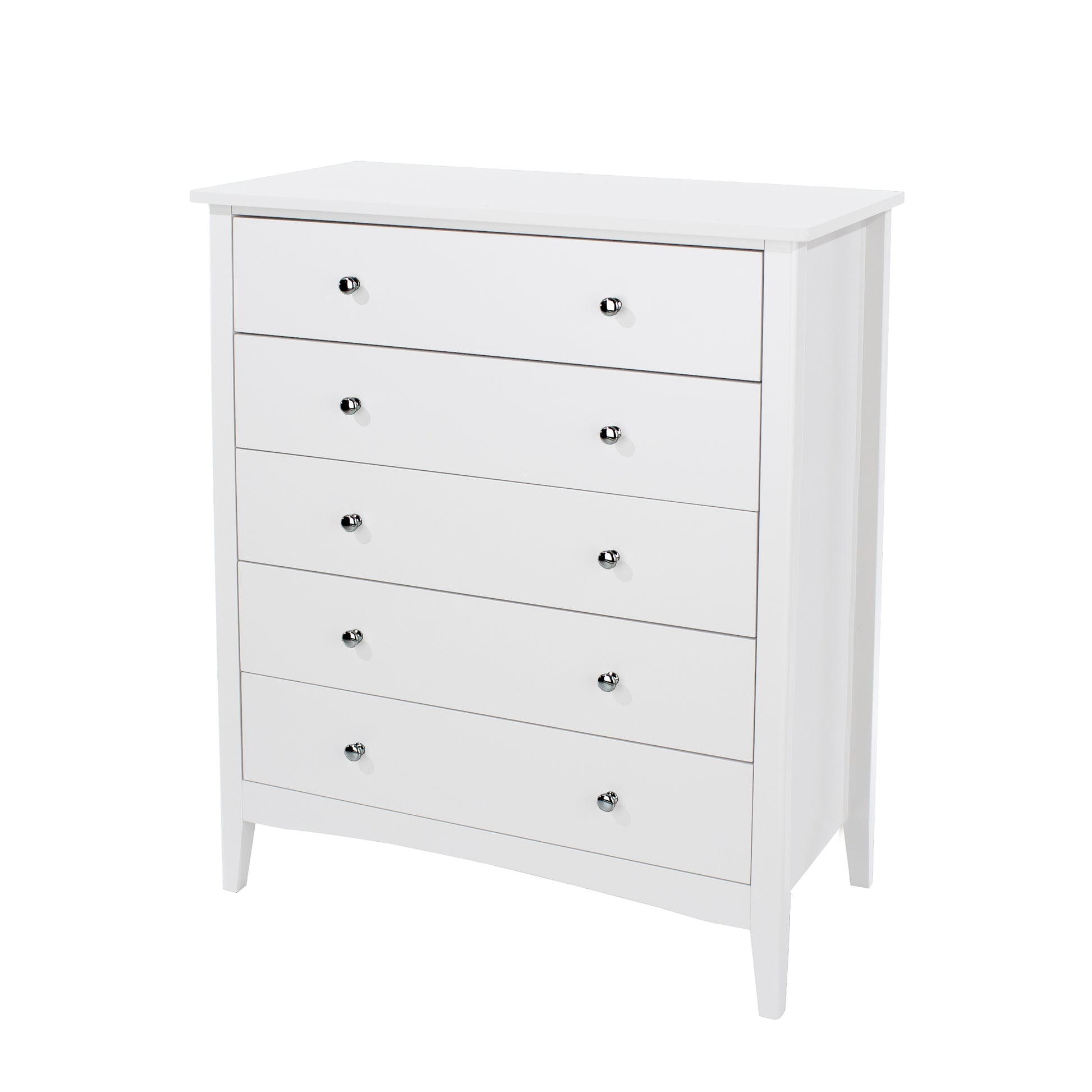 This 5 drawer chest features a luxurious white paint finish, complimented with tapered legs, real metal handles and easy glide drawers