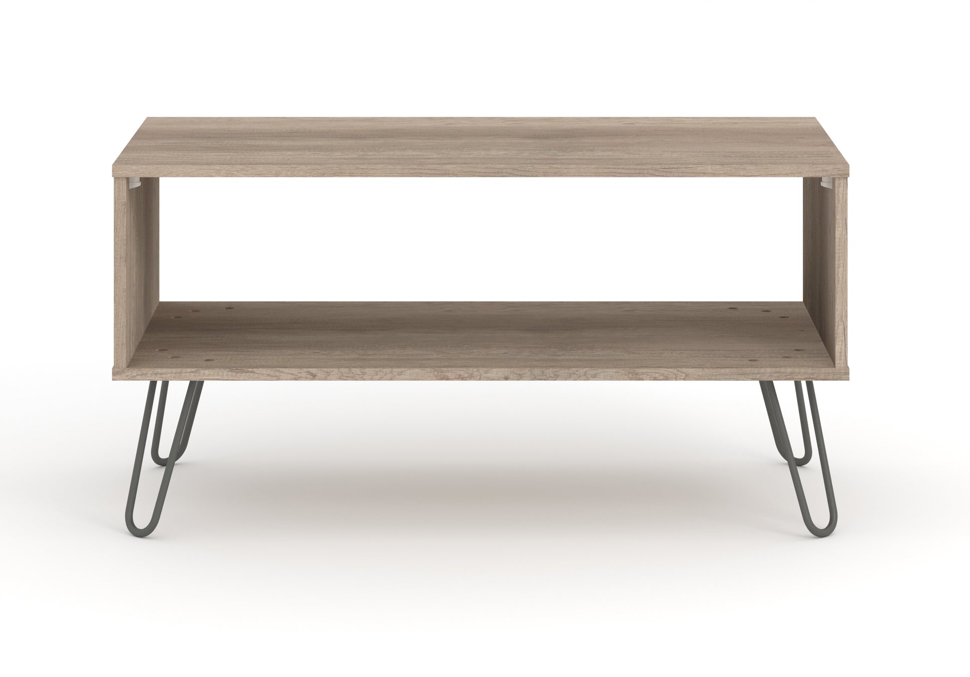 A great centre piece, this industrial look coffee table has useful undershelf storage in an easy to clean driftwood effect melamine finish with plastic pull handles and metal feet.
