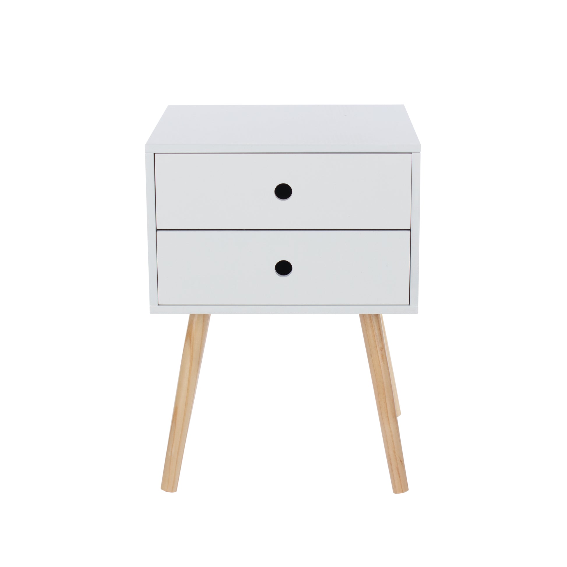 This contemporary styled white painted bedside features a 2 drawer cabinet with finger apertures on tapered natural wood legs