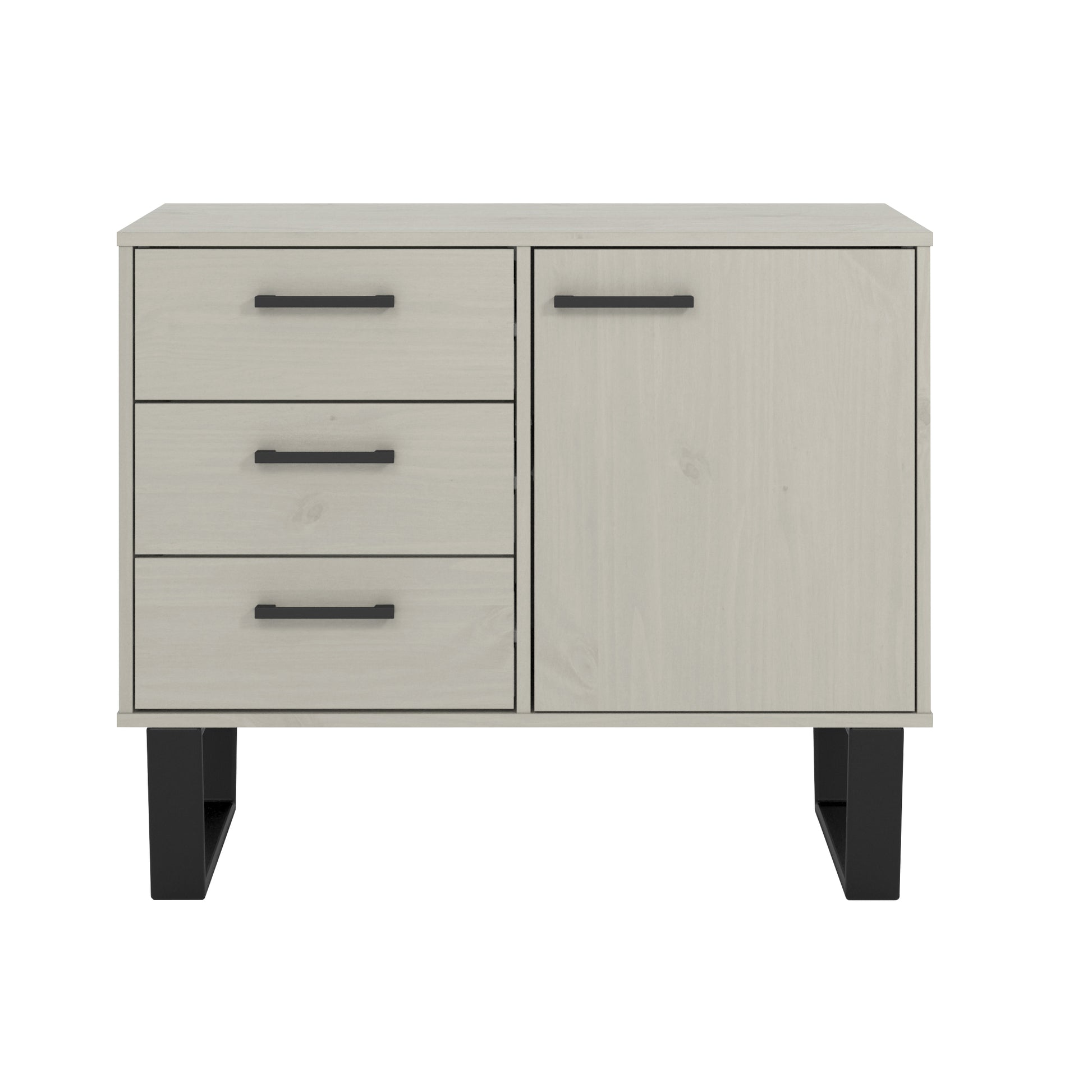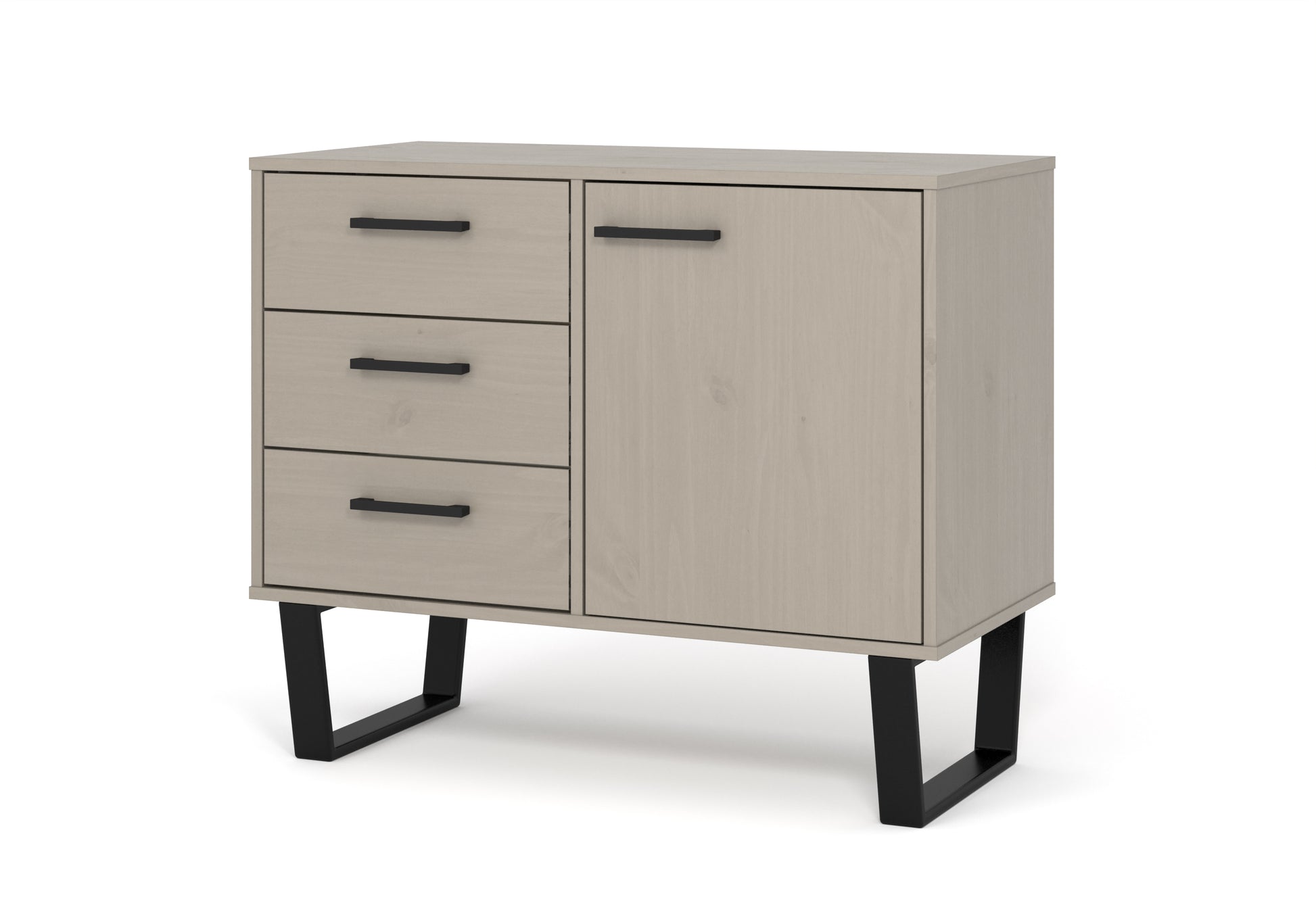 Our compact industrial styled small sideboard offers plenty of drawer and cupboard storage in a grey wax finish with black pull handles and metal underframe.