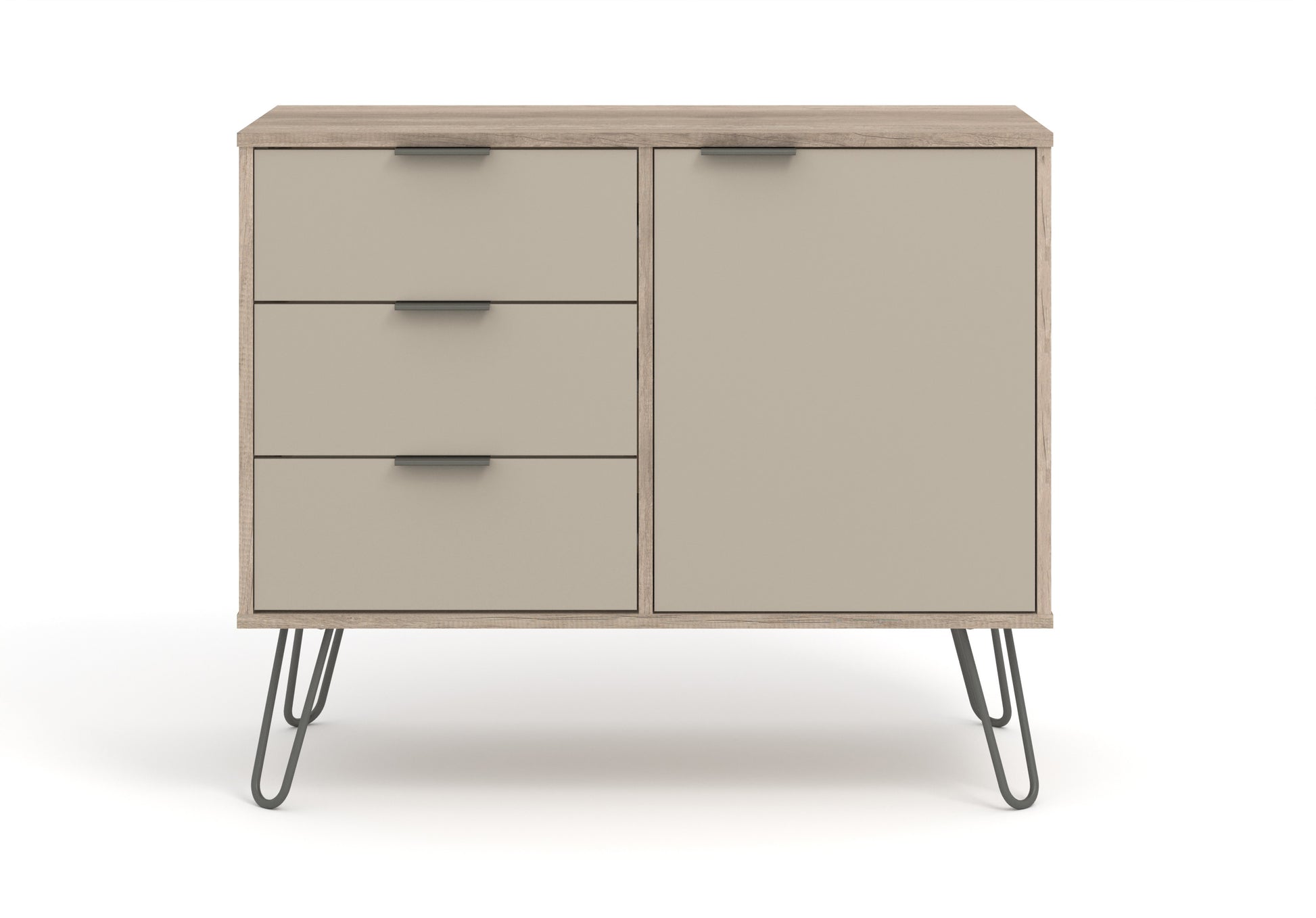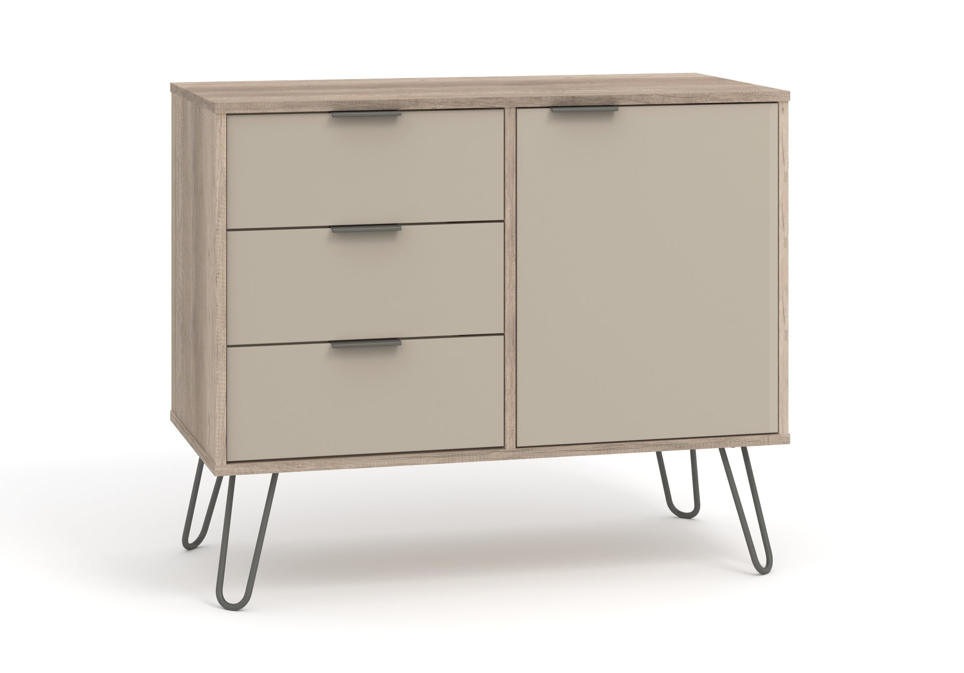 Our compact industrial styled small sideboard offers plenty of drawer and cupboard storage in a combination of driftwood and calico effect finishes in easy to clean melamine with plastic pull handles and metal feet.