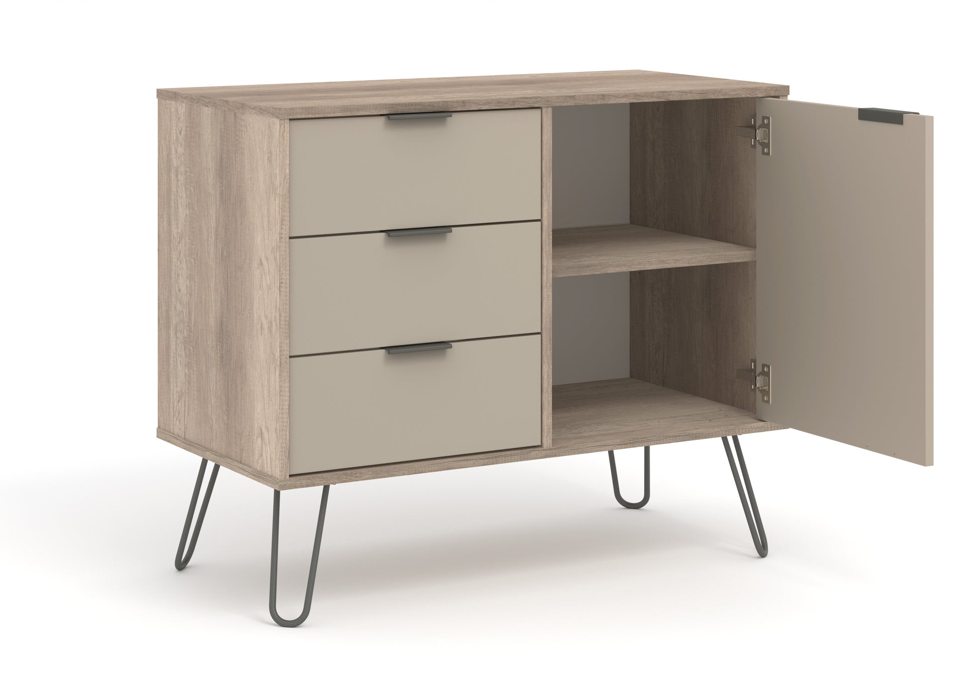 Our compact industrial styled small sideboard offers plenty of drawer and cupboard storage in a combination of driftwood and calico effect finishes in easy to clean melamine with plastic pull handles and metal feet.